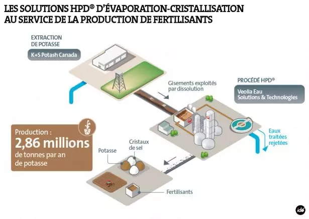 Několik měsíců po španělské společnosti Iberpotash, je to K+S Potash Kanada, filiálka jednoho ze světových lídrů v produkci solí a hnojiv, německé skupiny K+S, která si vybrala společnost Veolia, aby zajistila inženýrskou část závodu na zpracování rudy, na svém novém dole na těžbu potaše, Legacy Project. Ten se nachází na jihu kanadské provincie Saskatchewan a měl by být provozuschopný na konci roku 2015 a stát se tak největším dolem tohoto typu v Severní Americe. Řešení společnosti Veolia umožní společnosti K+S Potash Kanada produkovat 2,86 miliónů tun potaše ročně v roce 2023. Těžba bude probíhat rozpouštěním dobývaných ložisek a následným vypařováním a krystalizací rozpuštěné rudy.