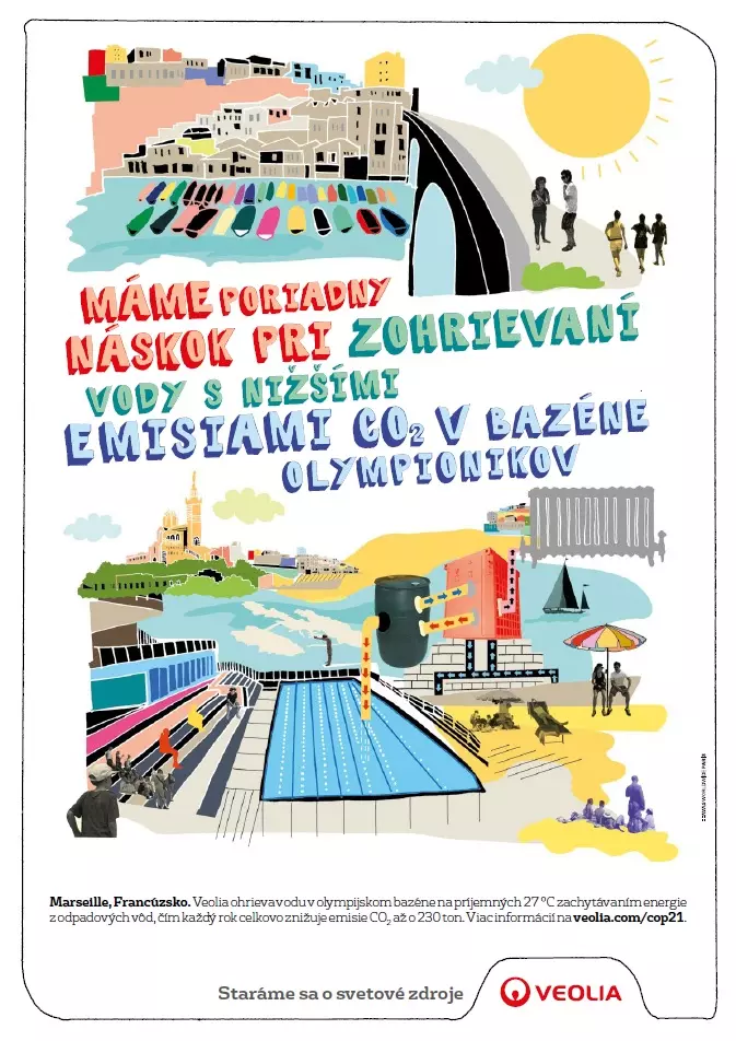 Marseille, Francúzsko. Veolia ohrieva vodu v olympijskom bazéne na príjemných 27 °C zachytávaním energie z odpadových vôd, čím každý rok celkovo znižuje emisie CO2 až o 230 ton. Viac informácií na http://www.veolia.com/en/campaign2015.