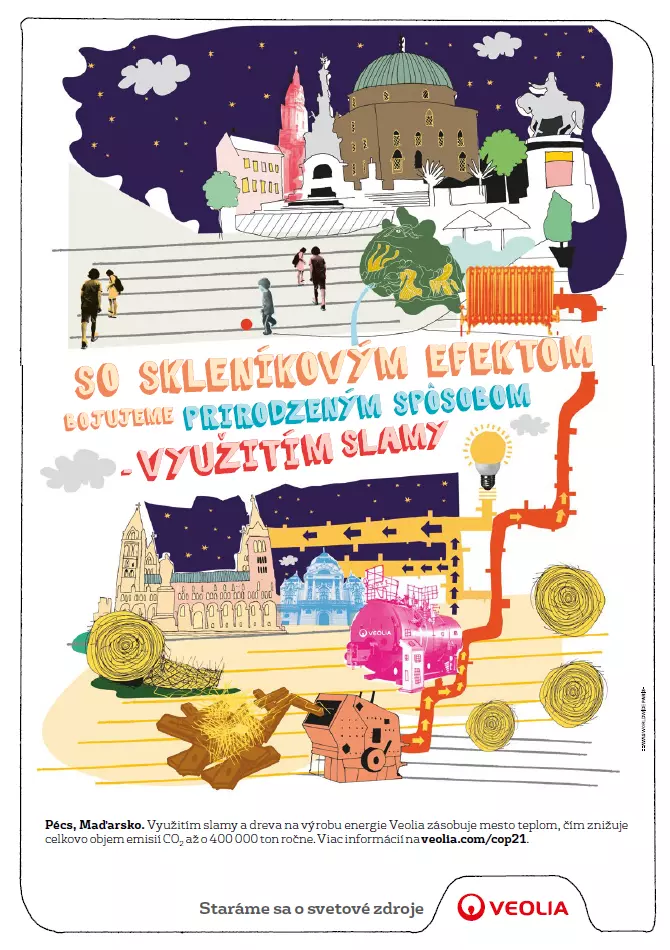 Pécs, Maďarsko. Využitím slamy a dreva na výrobu energie Veolia zásobuje mesto teplom , čím znižuje celkovo objem emisií CO2 až o 400 000 ton ročne. Viac informácií na http://www.veolia.com/en/campaign2015.